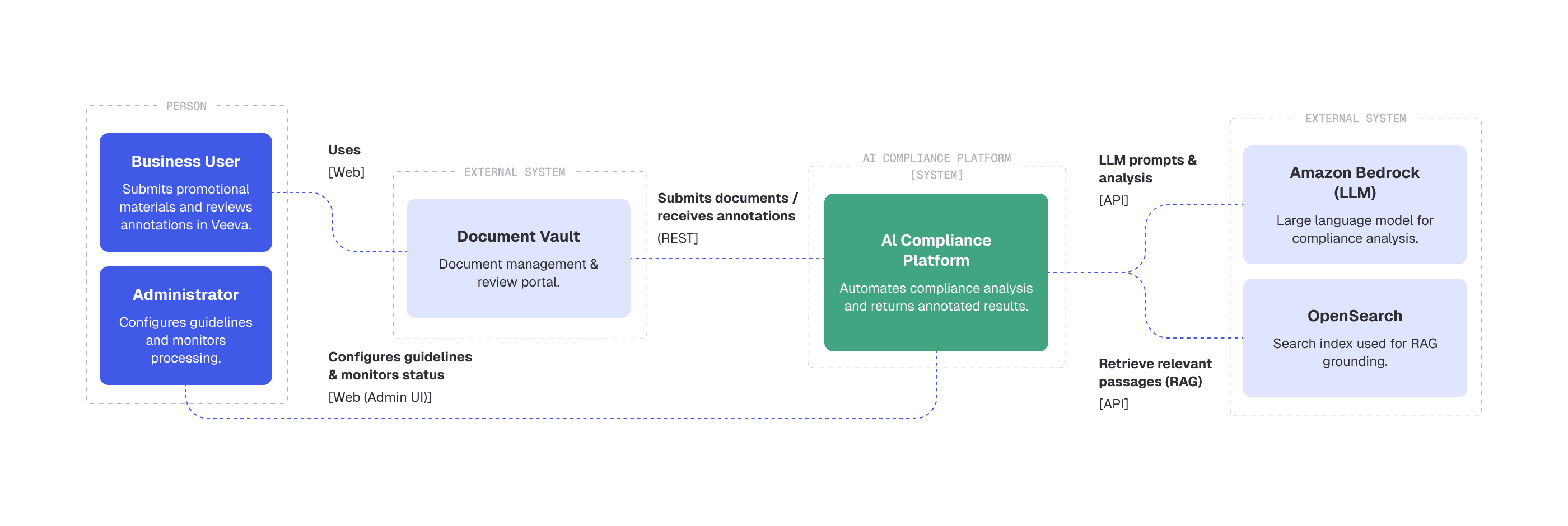 Cloud-Native Scalability The platform leverages AWS-managed services (ECS Fargate, Lambda, S3, Bedrock, OpenSearch, PostgreSQL) to scale automatically and adapt easily to new regulations, products, and AI models.