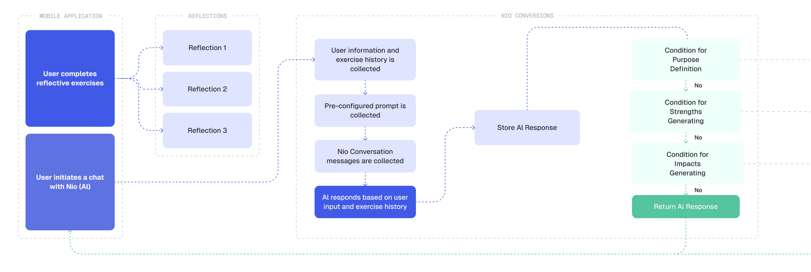 Roko Labs developed a custom AI orchestration system—branded Nio—designed to guide users through self-reflection and help them gradually uncover their strengths, impact, and personal purpose. At the heart of the solution is a network of AI models, each powered by its own unique prompt and logic, working together in real time to create a seamless and personalized experience. During beta testing with Purpose Book, the system showed strong user engagement and performance, with the following results: