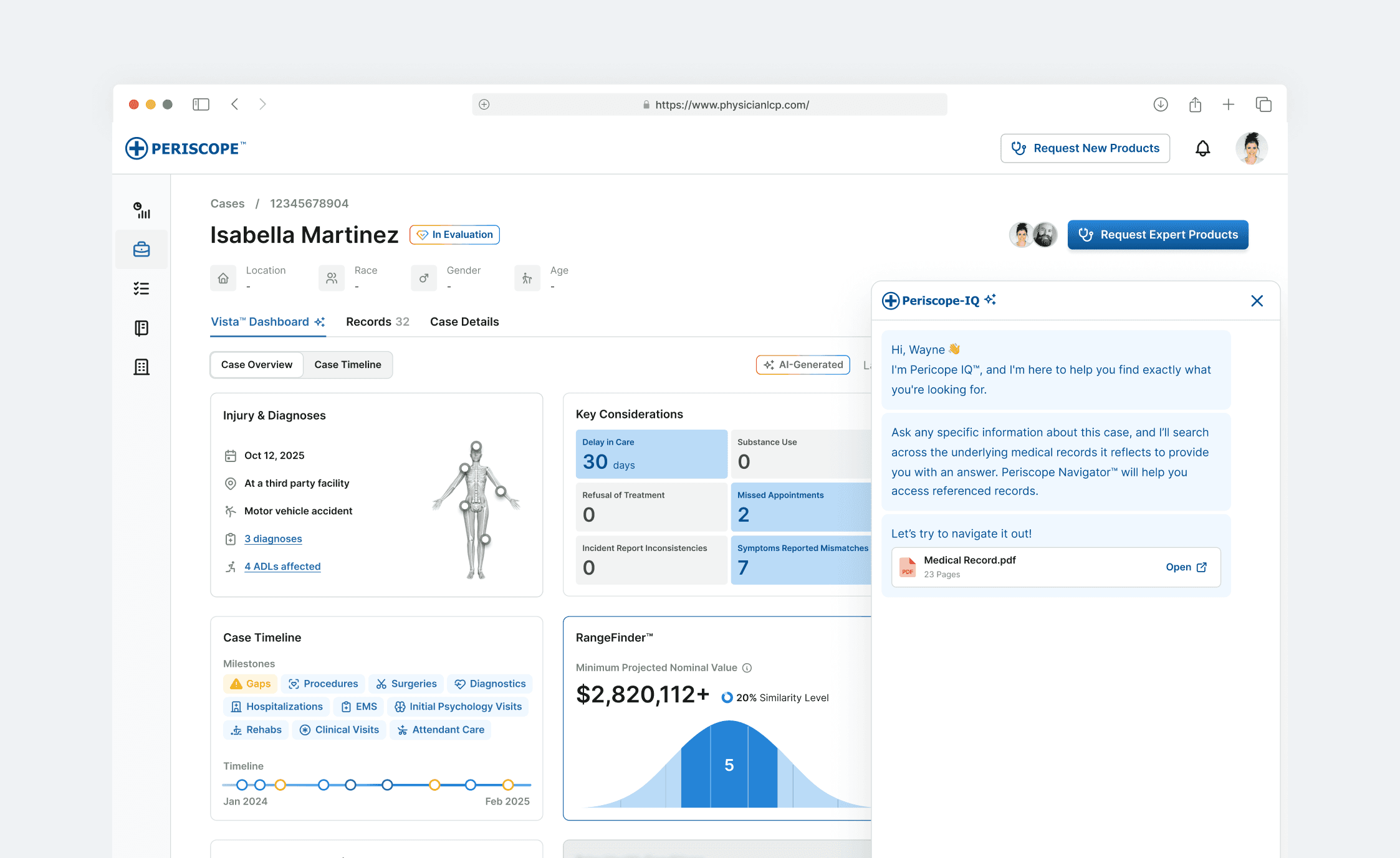 The Periscope dashboard provides a consolidated, structured representation of medically relevant information extracted from a case’s underlying records. Its primary purpose is to support personal injury attorneys and paralegals in evaluating new cases quickly, determining case viability, identifying potential risks, and understanding the overall treatment picture without manually reviewing every record.